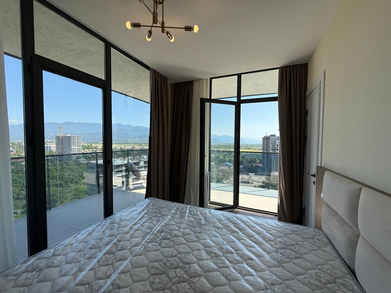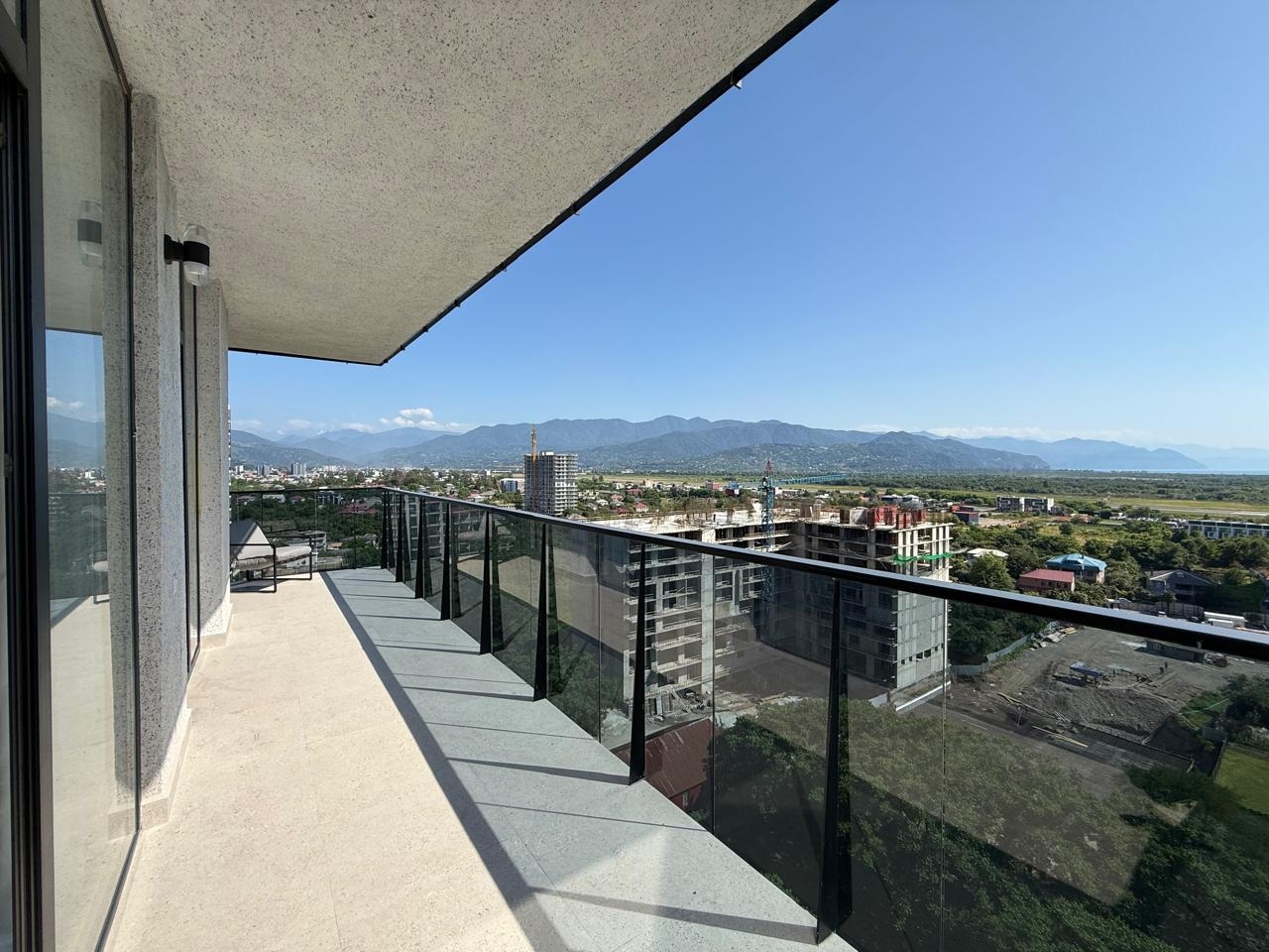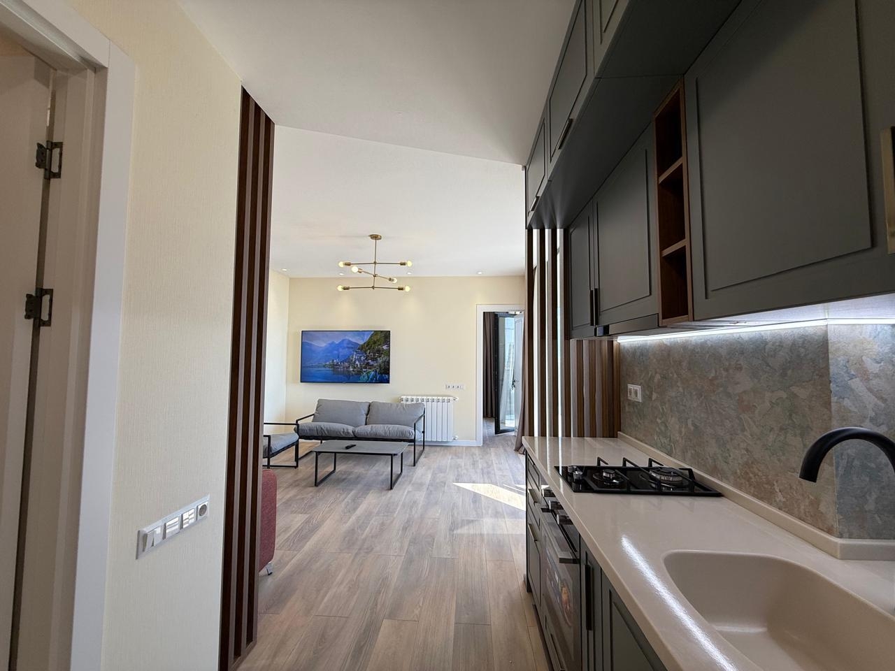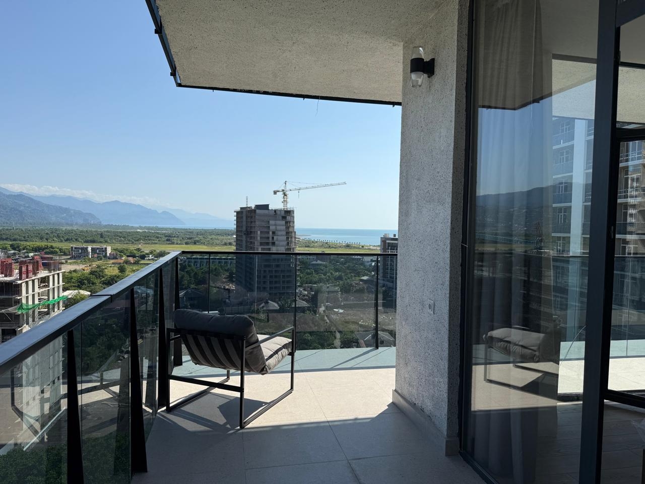 The apartment is brand new, with high-quality renovations completed, and has never been lived in. The space includes a separate bedroom, a living area, and a large terrace with panoramic views of the mountains, city, and sea. All necessary appliances and furniture are installed, and central heating is installed.