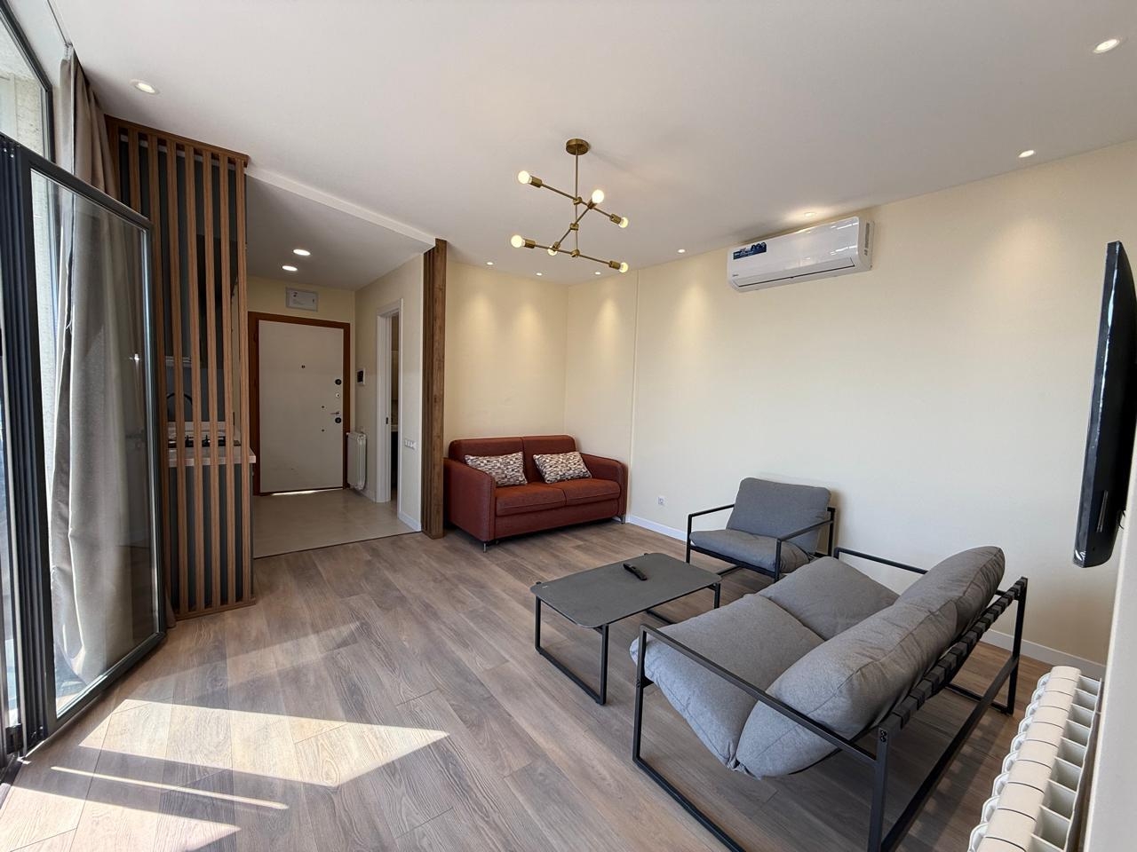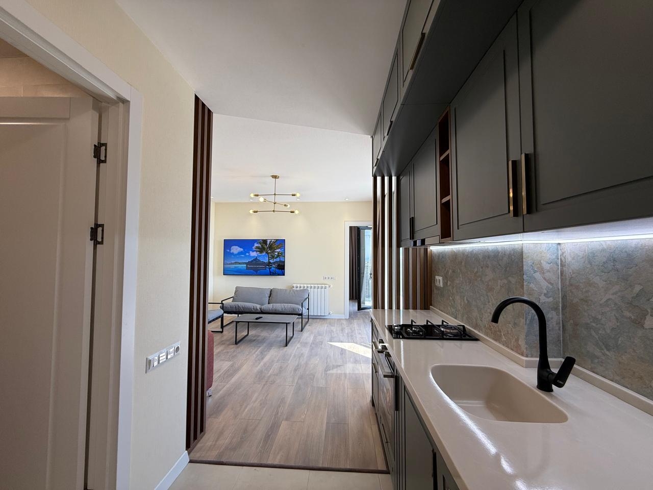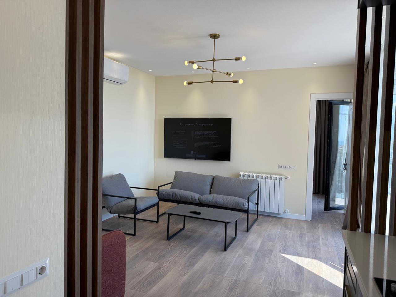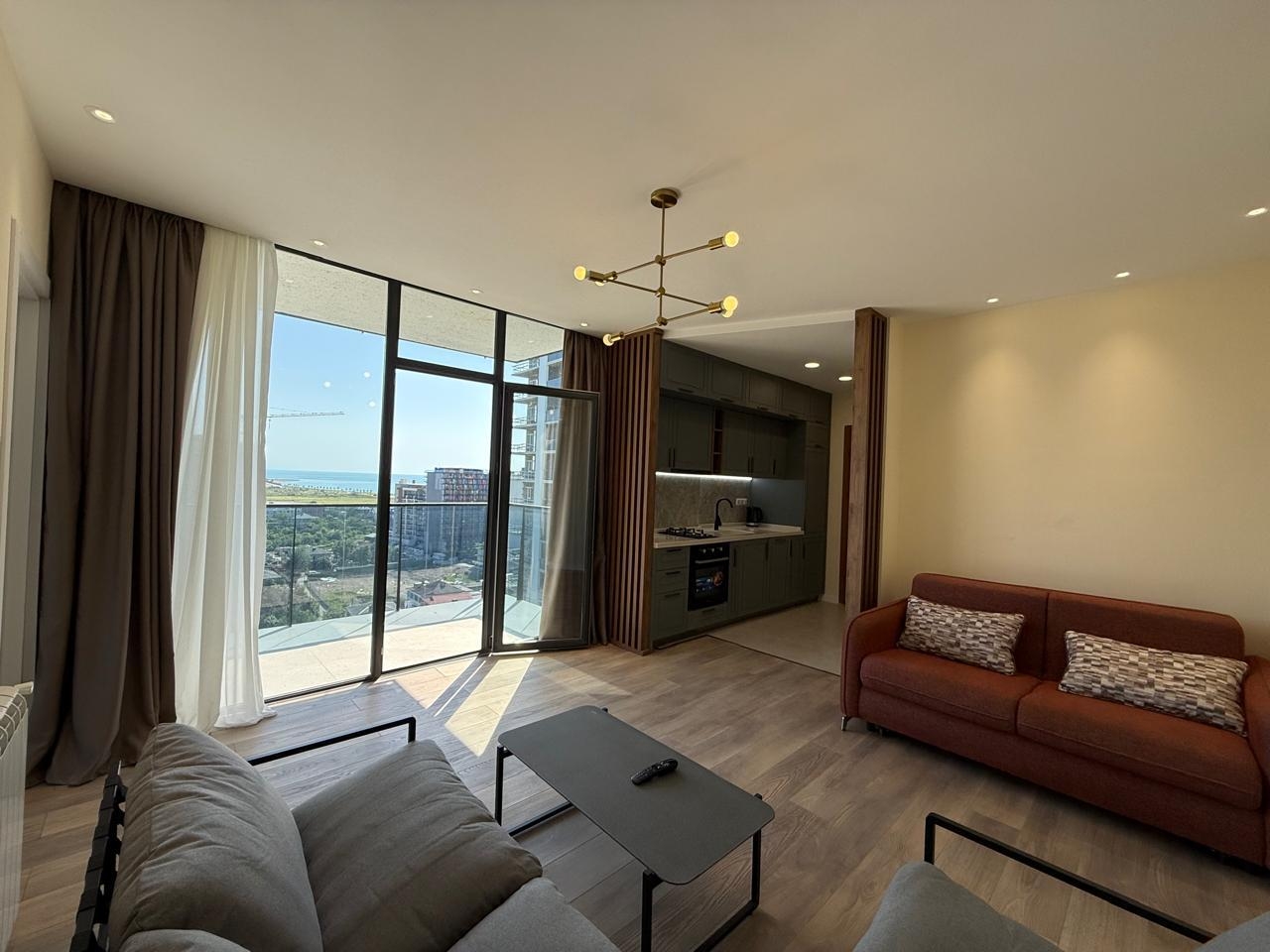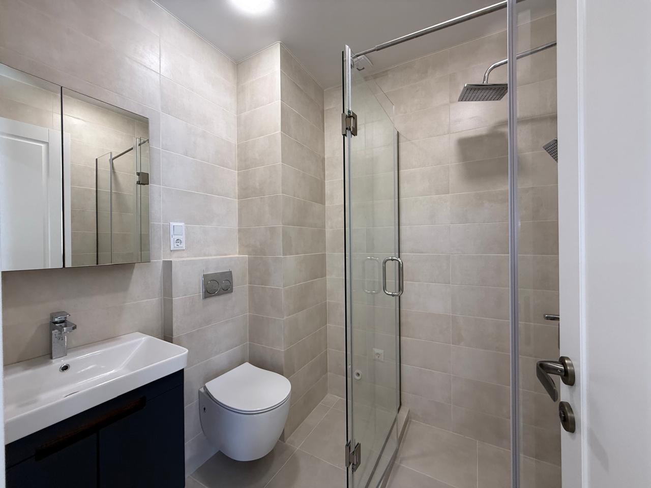 The apartment is brand new, with high-quality renovations completed, and has never been lived in. The space includes a separate bedroom, a living area, and a large terrace with panoramic views of the mountains, city, and sea. All necessary appliances and furniture are installed, and central heating is installed.