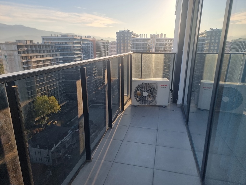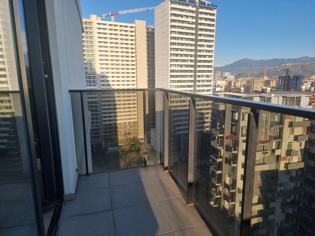 The apartment is located on the 16th floor and features a balcony with mountain views.